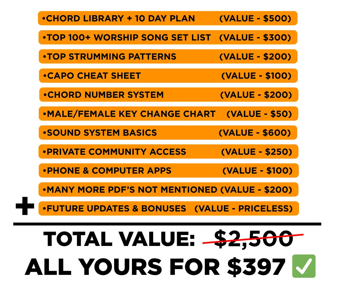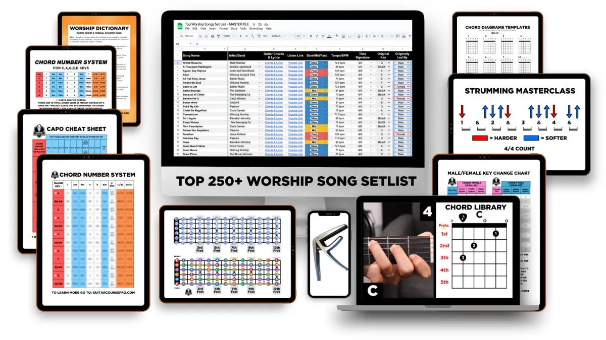 Determined to fill that gap, Luke created a course built on what actually matters for worship: simple, practical music theory, clean and professional-sounding strumming patterns, essential gear setups, and done-for-you resources like chord charts, number system guides, transposing tools, and organized worship song lists.